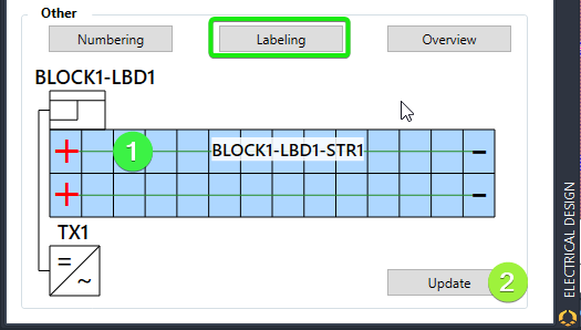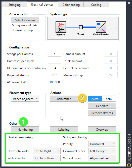 In order to ensure proper placement of the Harness + & - connectors, it is important to define the numbering of strings with the correct priority and order. This is not as important when each harness is contained within one frame, but becomes critical when harnesses have strings on separate frames. Numbering correctly during device generation (1) can avoid tedious manual "Renumber" (2) if any changes are necessary.