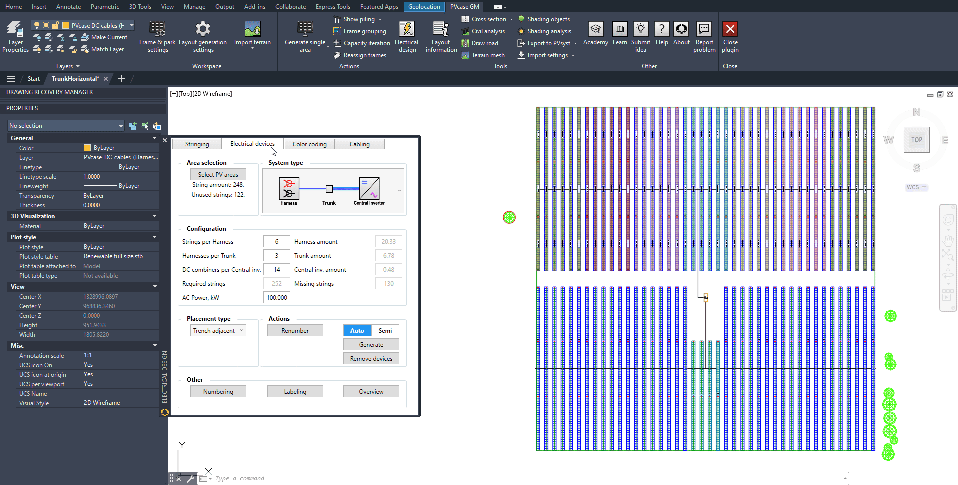 To generate the string to harness and harness to trunk cables, select DC String Cabling and Auto. Also make sure that any required vertical trenches to run strings to harnesses are preselected at the top of the window. Click on Generate and when prompted, select the Central Inverter (Transformer):