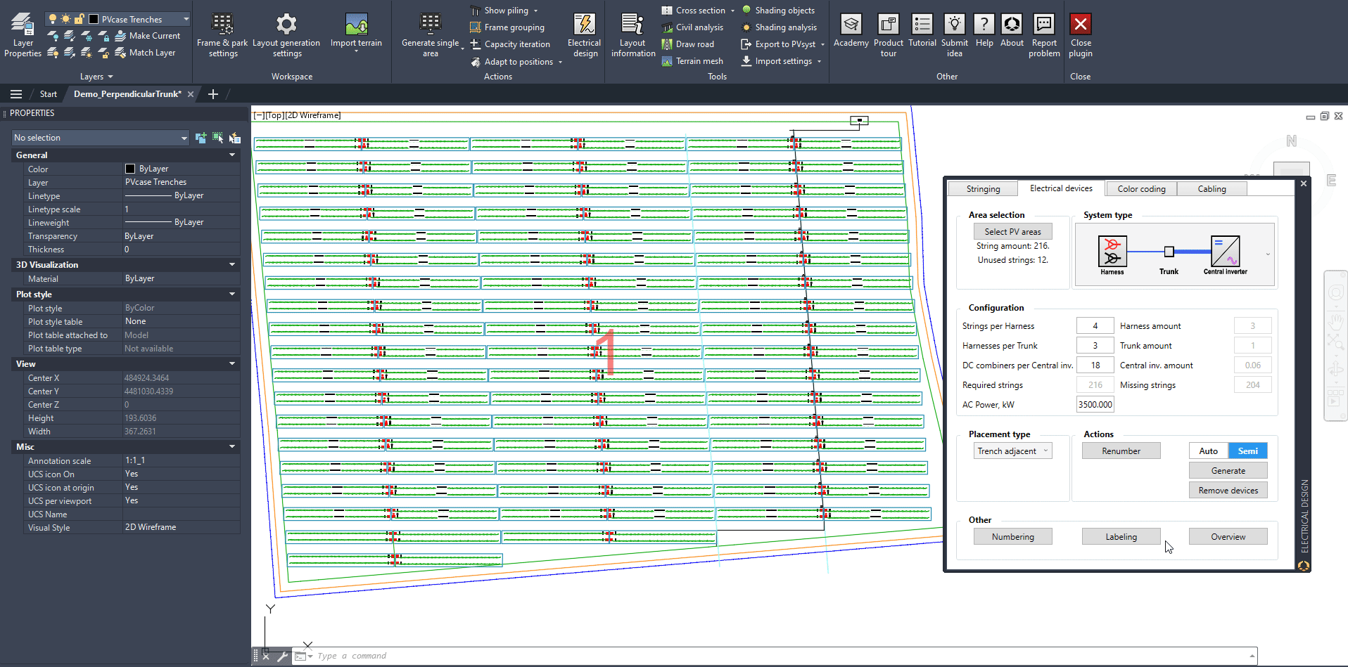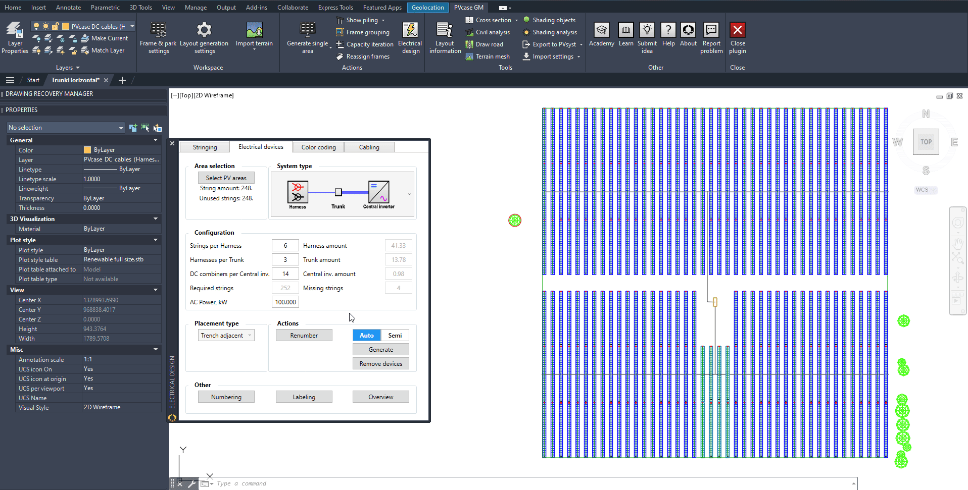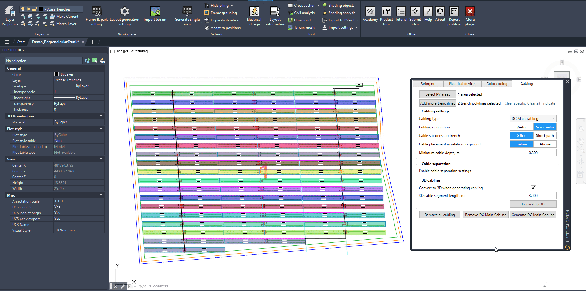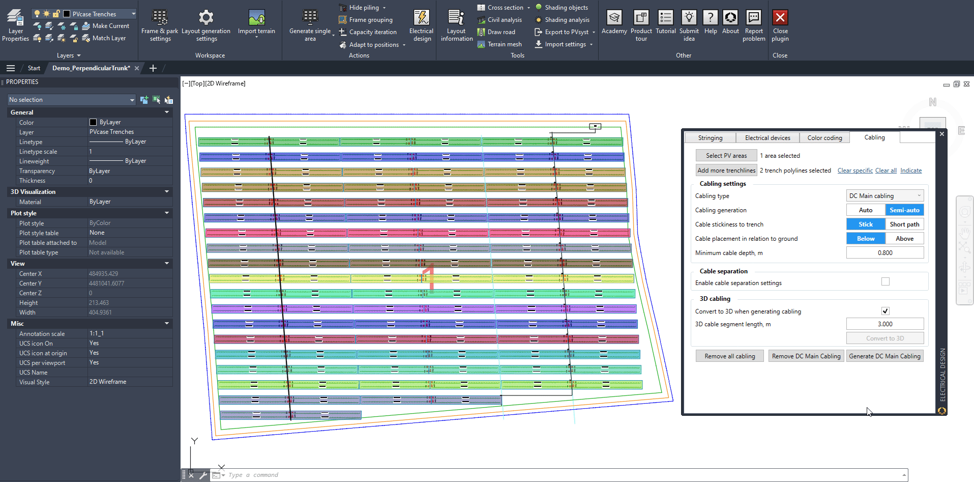 To generate the vertical N-S feeders from the LBDs to the Inverter, select DC Main cabling and Semi-auto, click on Generate and when prompted, select only the LBDs (not the harnesses) and a N-S trench that runs next to those LBDs, all the way up to the Central Inverter: