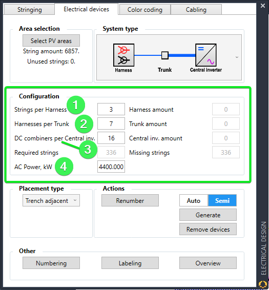 The user can define the "String per harness" (1), "Harnesses per trunk" (2), "Trunks per Central Inverter" (3) and "AC Power" per Central Inverter (4):