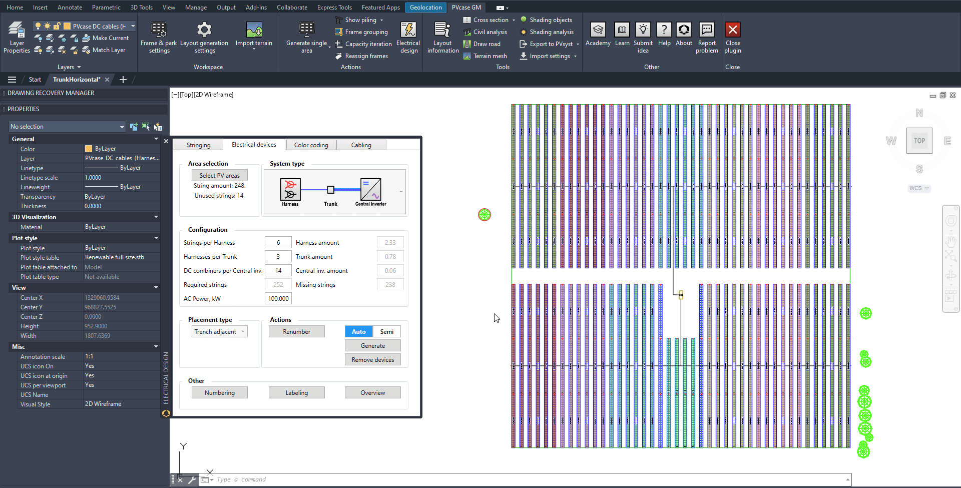 Depending on how regular each block is, different combinations of "Auto" and/or "Semi" electrical device generation steps can be used. In this example, "Semi" is used in order to ensure proper grouping of strings to harness: