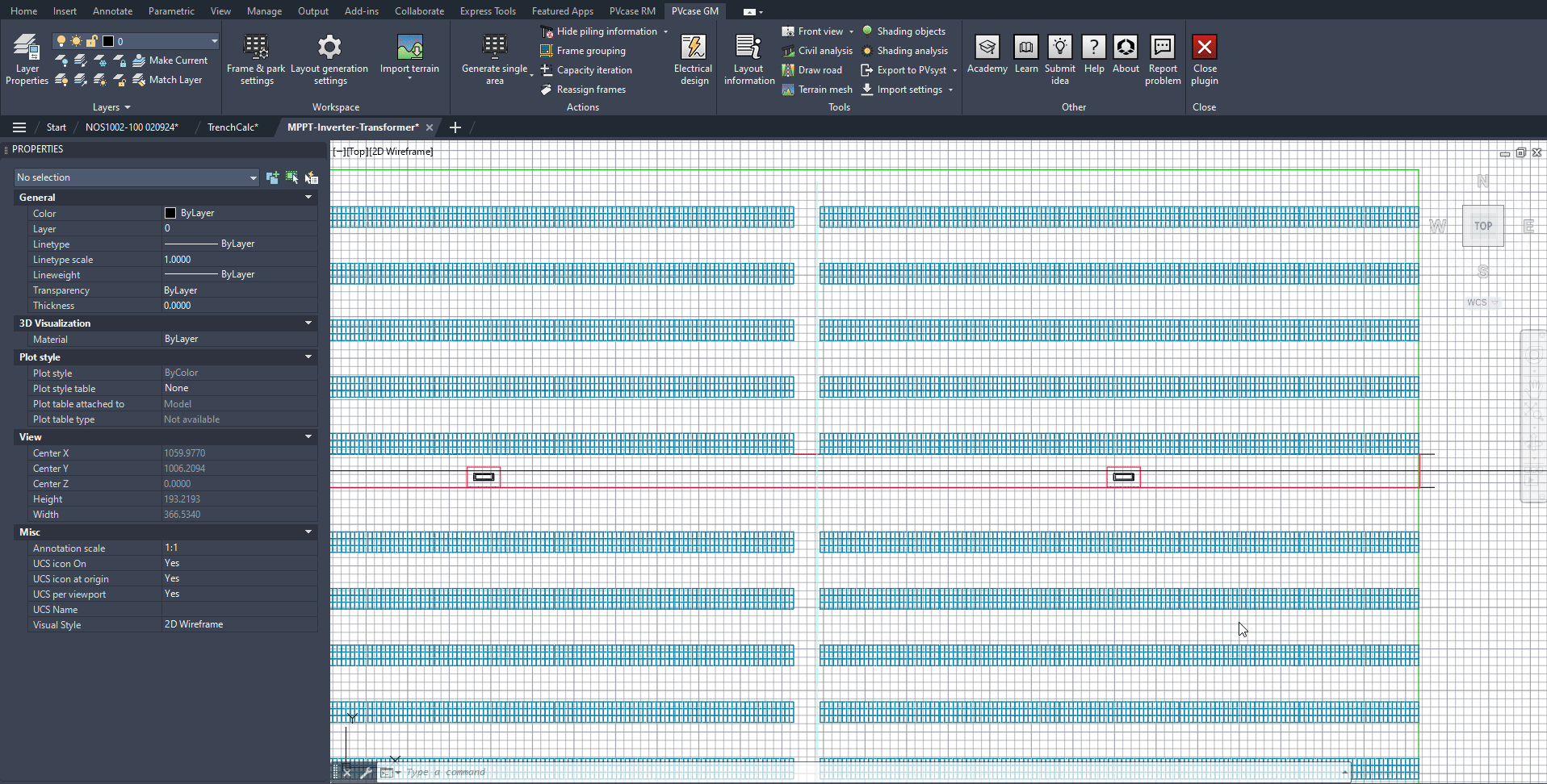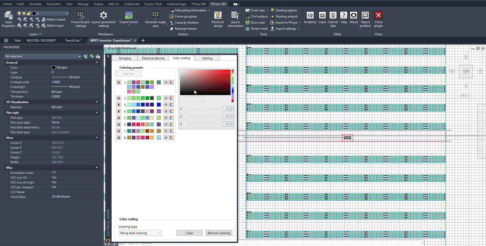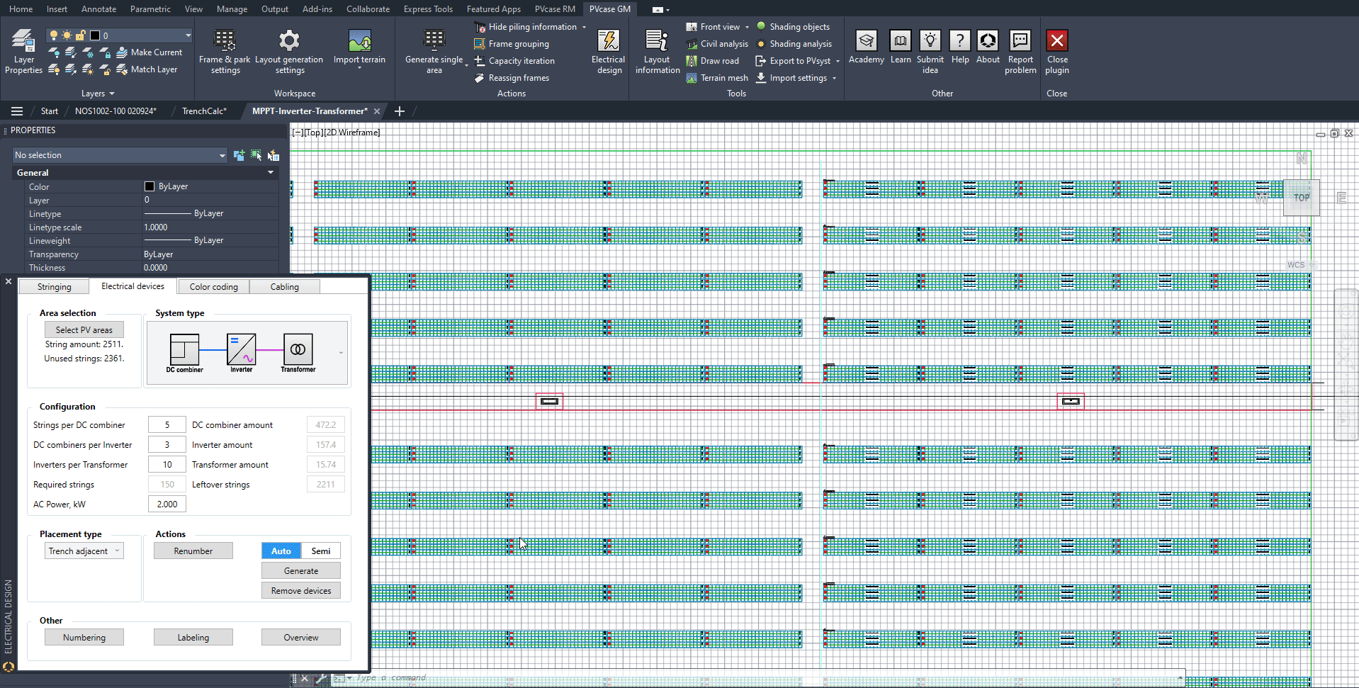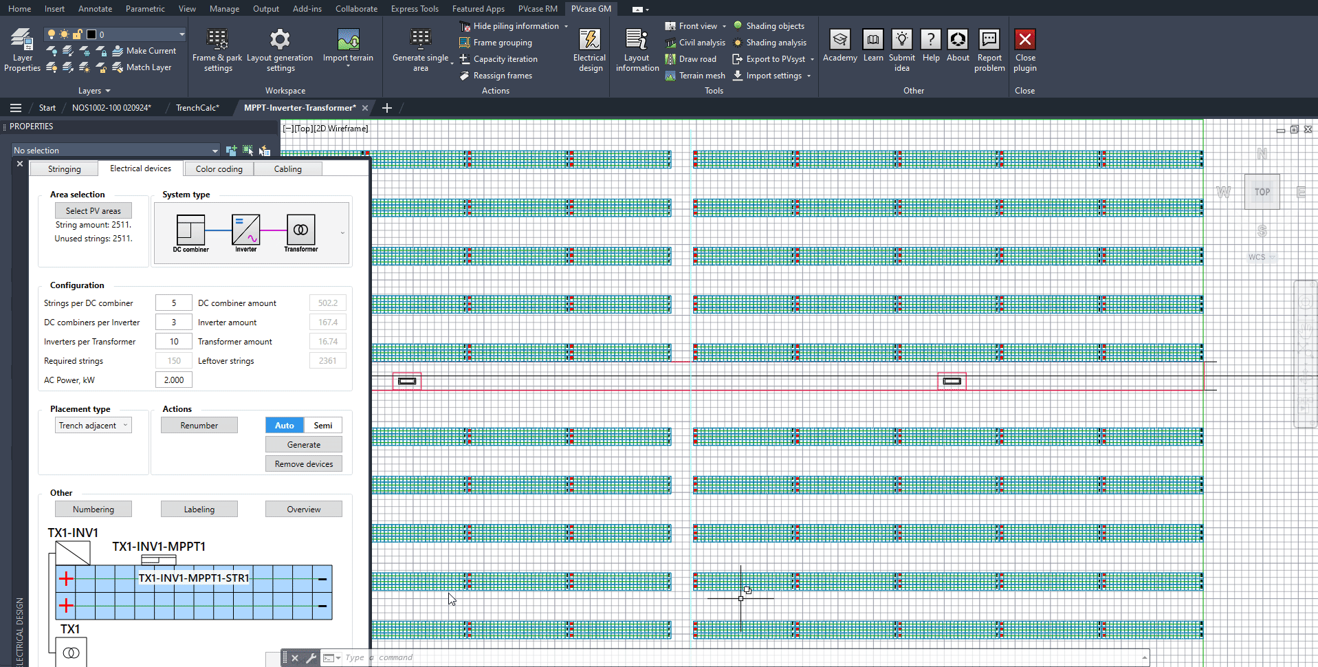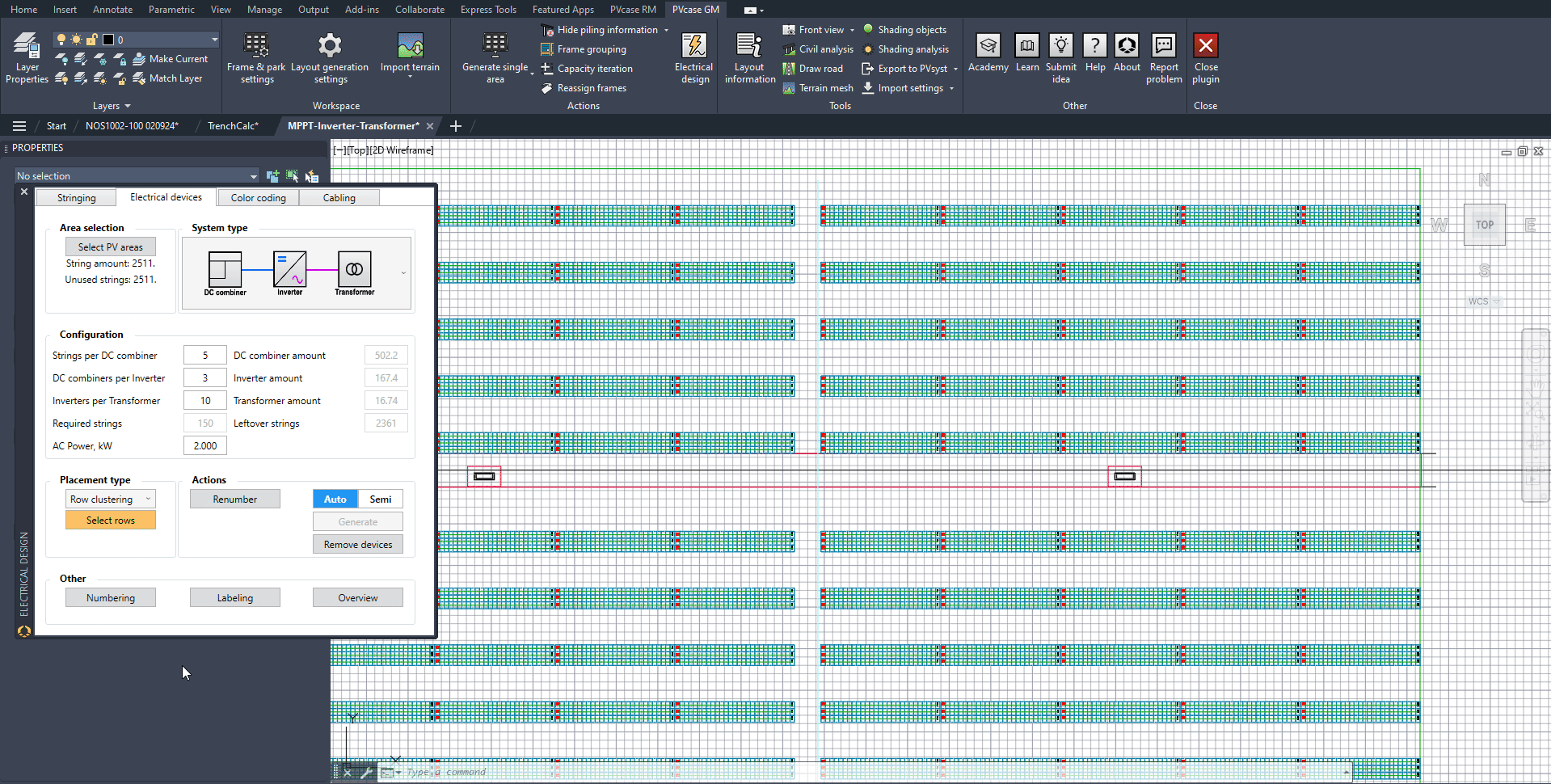 At this point, the generation of electrical devices can proceed by clicking Auto/Semi. When the layout is fairly regular, the Auto option could work fine, but if it is quite irregular, the Semi option will give you more control over the MPPT arrangement. For this example, the Auto option will be used, but selecting each transformer block separately, so that each block can have its own group of strings and independent alignment line, as this will ensure an adequate string to MPPT allocation.