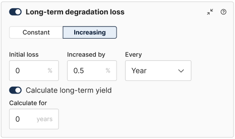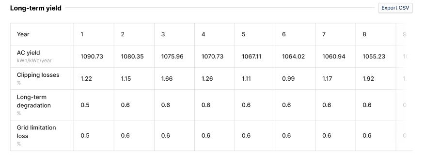 This can be seen in the losses input section, as shown in the images below. Also, after the simulation, on the Results page, you will be able to view the calculation results together with yield, clipping, long-term degradation and grid limitation losses.