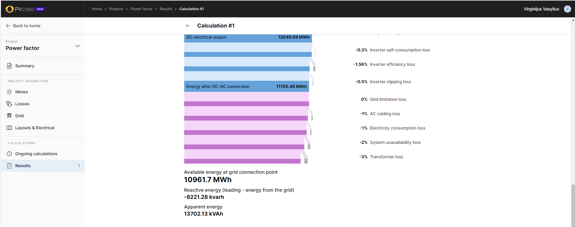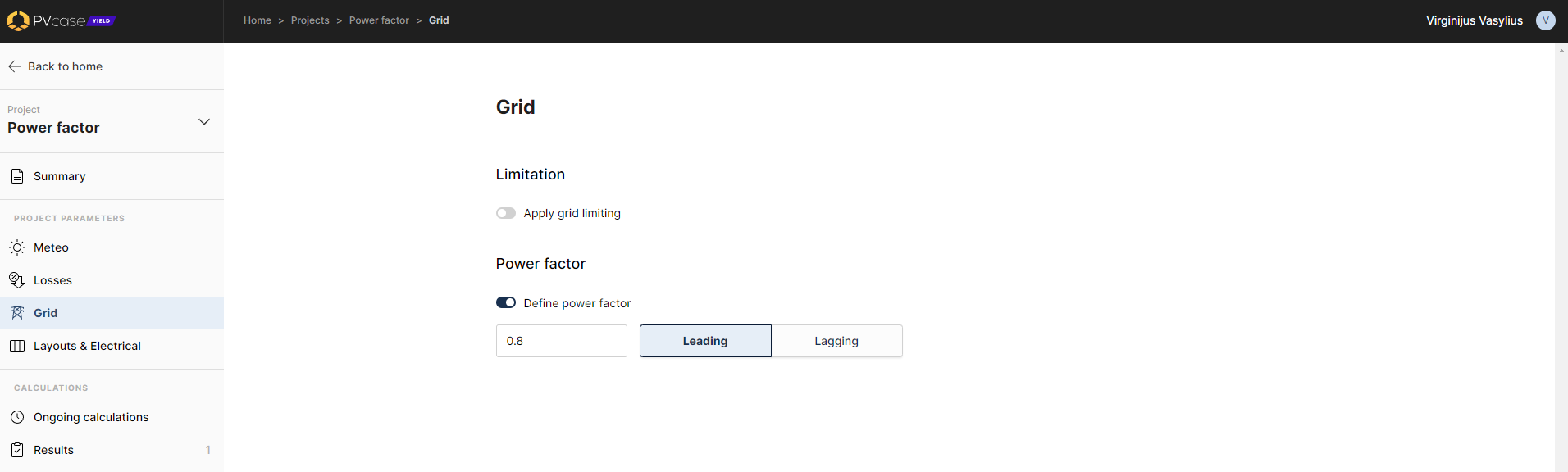 PV engineers would like to model the power factor, as utilities mostly ask for this. The size of the power factor helps to describe how efficiently the power is used. Power factor size and type can be specified on the grid page as shown below: