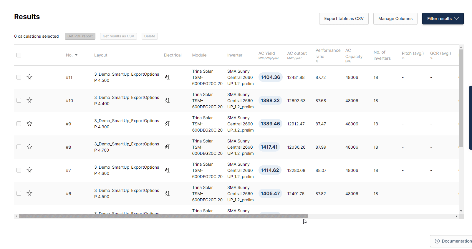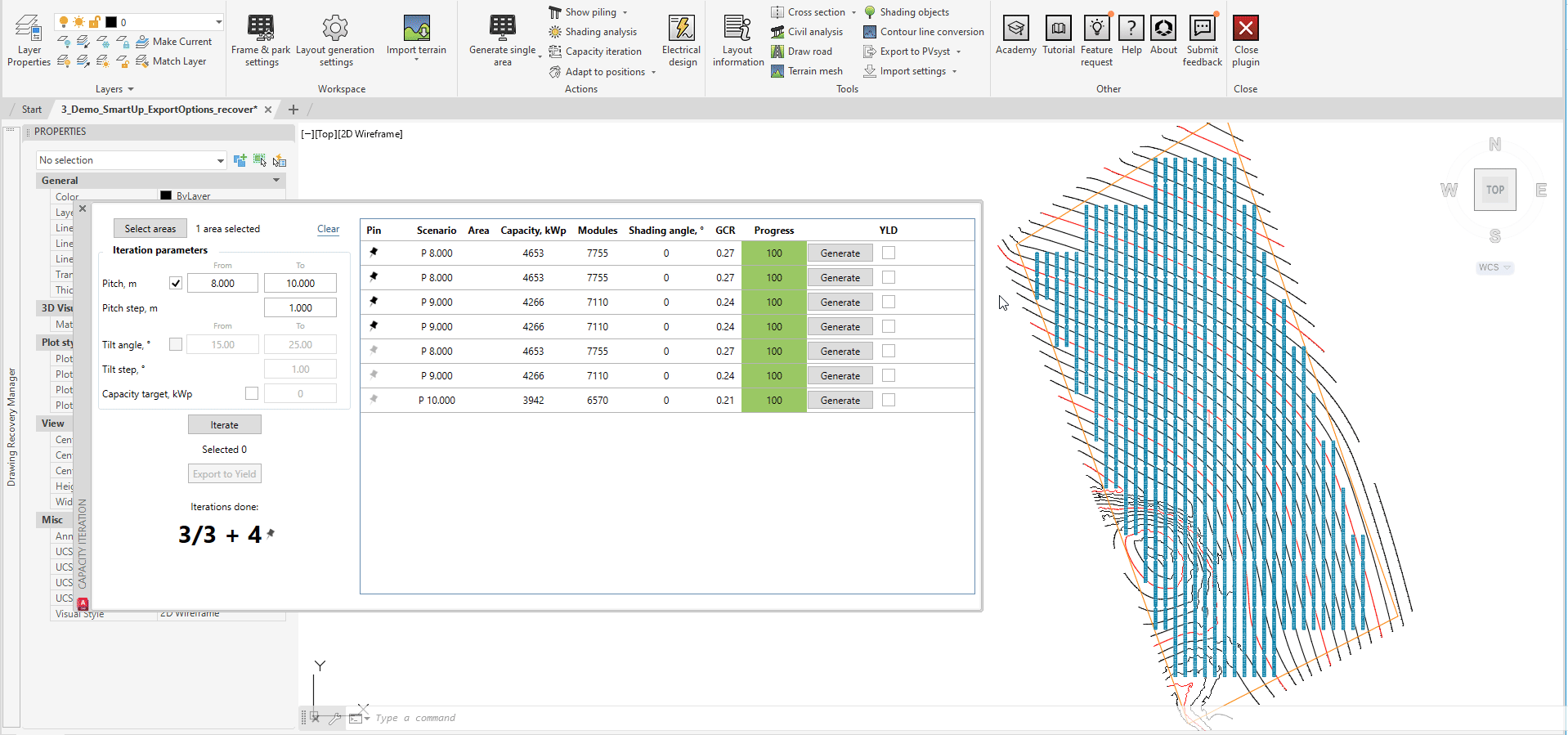 The recently revamped "Capacity Iteration" tool can be used to generate, compare, save and reiterate center for multiple designs. The user has the option to generate different scenarios based on different pitch (and tilt for fixed systems), analyze the options, pin the preferred scenarios and add new designs to the list by choosing different Frame and Park Settings parameters before reiterating: