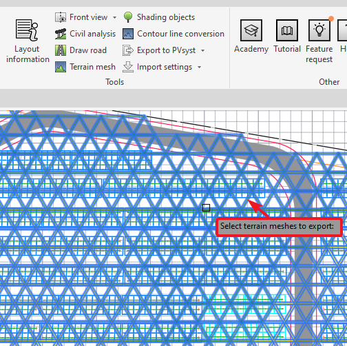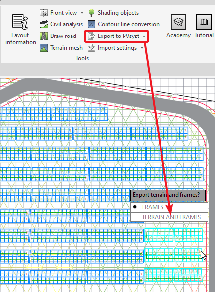 In order to export the terrain used in the GM design to PVsyst a Mesh needs to be generated for it first. Once that is done, the user can select "Export to PVsyst" in the Top ribbon and then select "Terrain and Frames" instead of only "Frames".