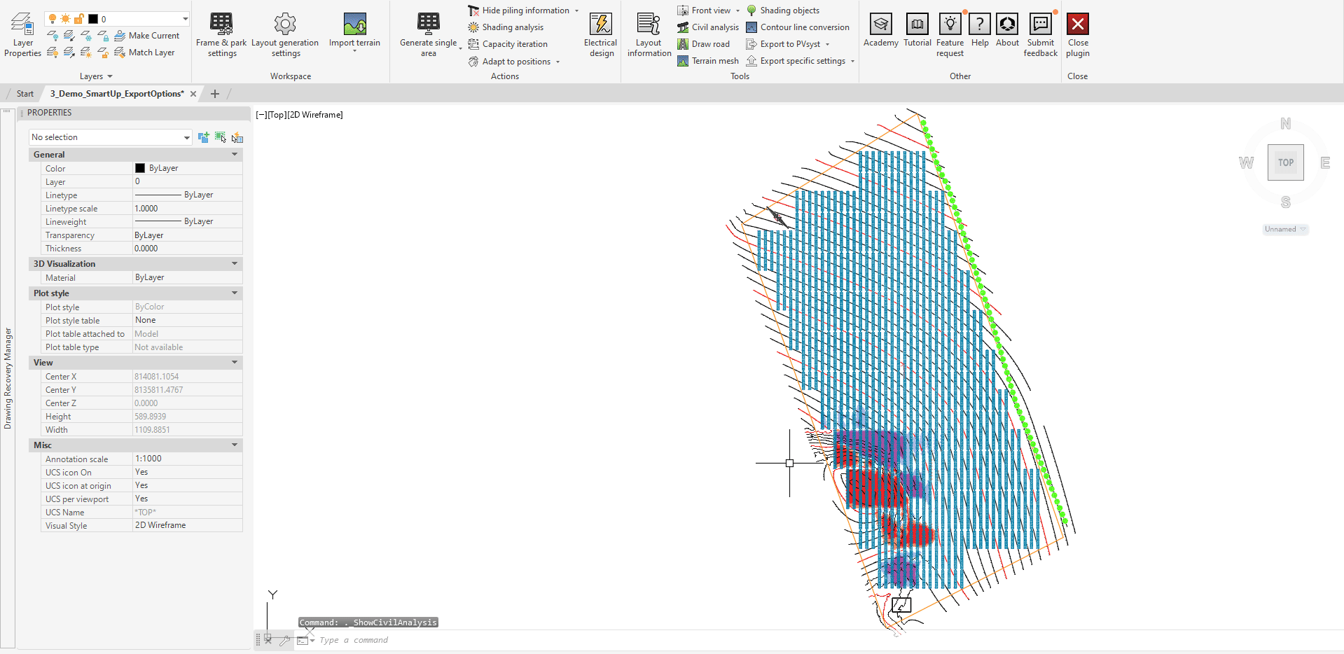 In order to make ground grading easier to interpret, an “Export to 3D view” button is available in the "Grounding grading" tab of the "Civil Analysis" window. When clicking on it, a web browser tab will be opened to show a detailed three-dimensional representation of the whole plant including frames, shading objects and terrain. The grading heat map will be overlaid upon the proposed topography.