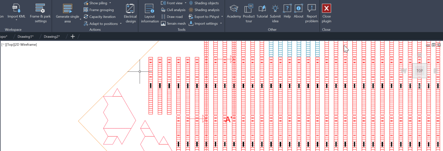 At a glance, you can check that the frames were placed in accordance with the slopes of the terrain and the software highlights the deviations from the main axis.