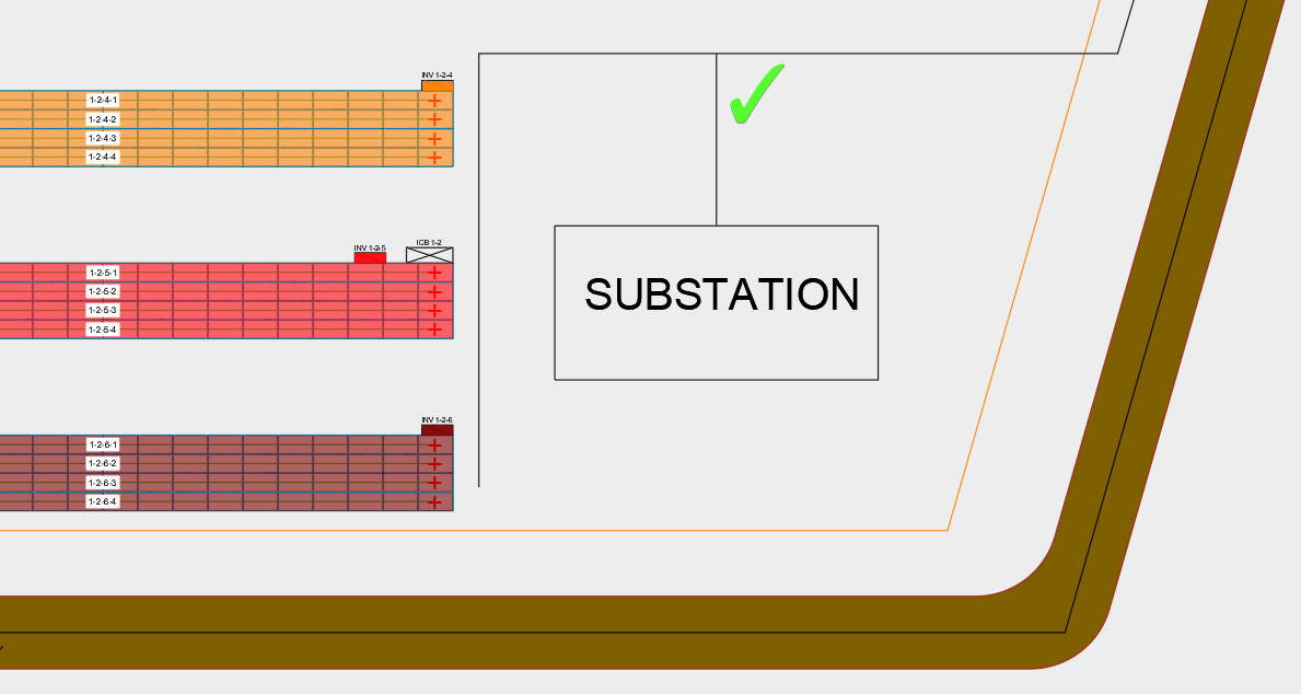 As you can see in the image above, the DC cabling was generated for all the strings and devices for this transformer. Each cable run is drawn as its own, thin blue polyline, which will be accounted for in the Bill of Materials.