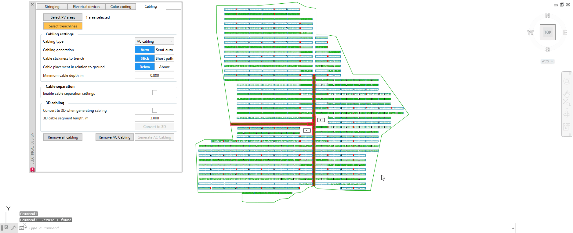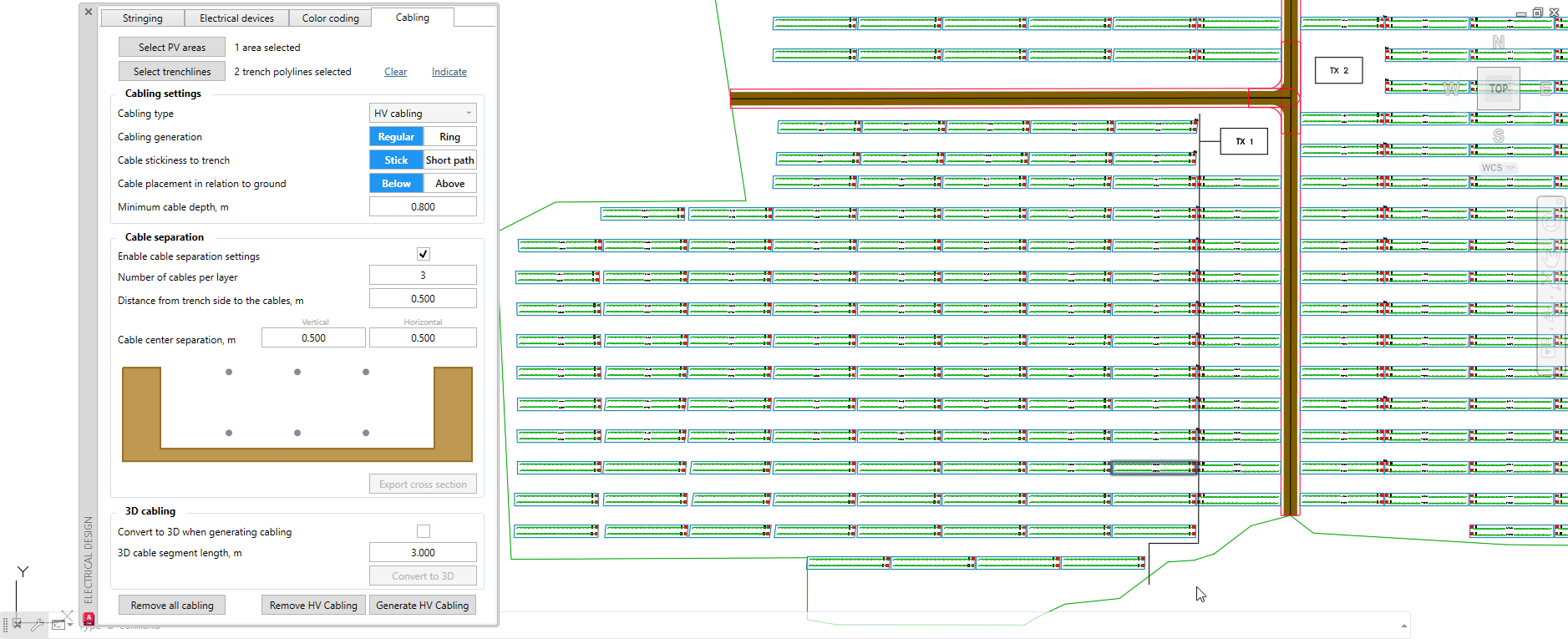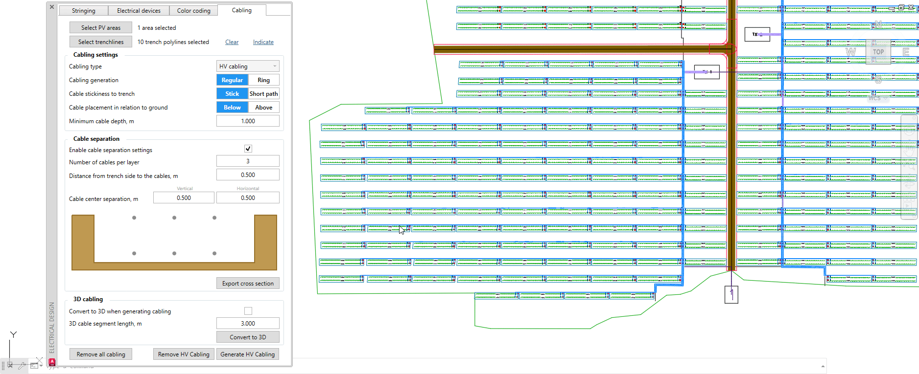 Once all trench lines are created, you may then return to the Cabling section in the Electrical design menu and click on Select trench lines. Select the newly-drawn trench polylines and press Space or Enter on the keyboard. Example below: