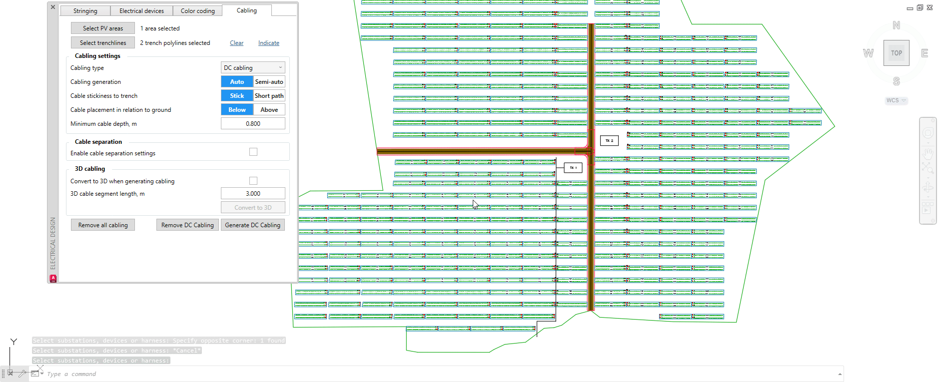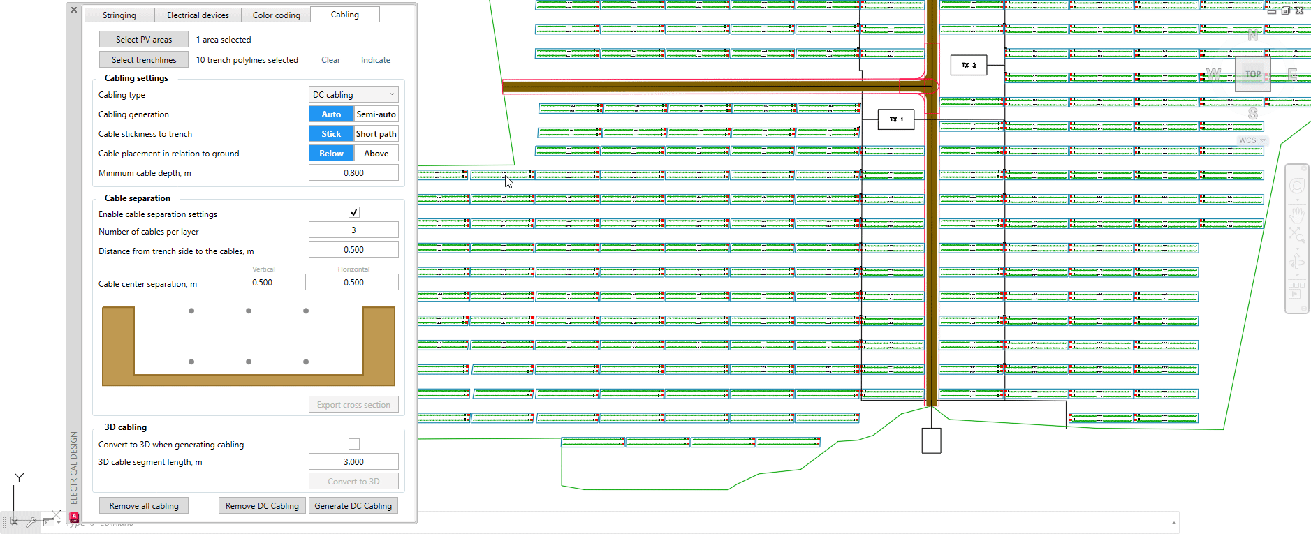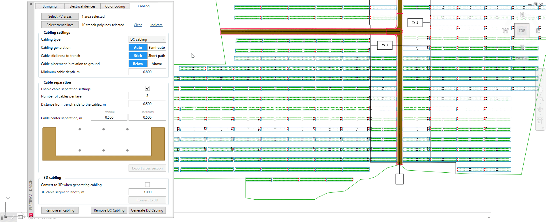 Once all parameters are adjusted to your needs, click on Generate DC cabling. You will then be prompted to select the transformer - having done so, press Space or Enter on the keyboard. Example below: