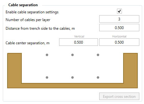 After enabling the checkbox in the pop-up window, you can set the Number of cables per layer, the Distance from the trench sides to the cables, and lastly Cable center separation Vertical and Horizontal.