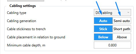 Semi-auto - mode allows the selection of individual strings or devices as well as to specify in more detail the route of the cable. That ultimately forces the software to design the cabling according to the trench lines that are being selected and not the software estimating which ones to use from a handful of selected trench lines.