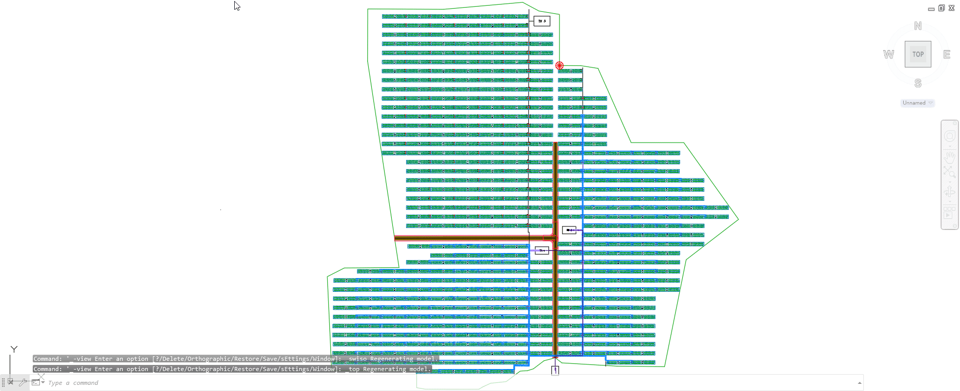 To observe this change, you may switch to SW Isometric in AutoCAD and zoom in. Should you prefer to do it manually, you may rotate the screen free-hand by holding the left shift and pressing on the mouse scroll wheel. The cables should now be visually moving from the frames, down into the terrain, and following the trench lines. Example below: