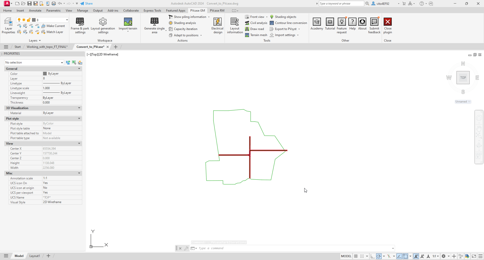 We are now able to select one or more PV areas (based on preference and/or viability) that you would like the tool to iterate. The Capacity iteration tool will remember your selection and will not require you to re-select should you need to reiterate the areas later. We will now select our PV area by clicking on Single Area in the Select areas field, and then selecting the target PV area boundary line. Then we are prompted to draw an alignment line - once we have drawn it, we press Enter or Space on the keyboard to finalize the selection.