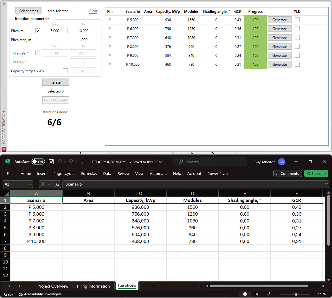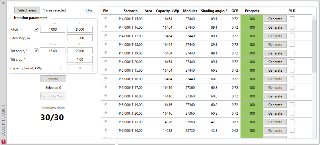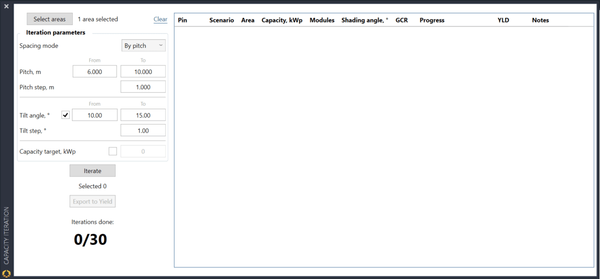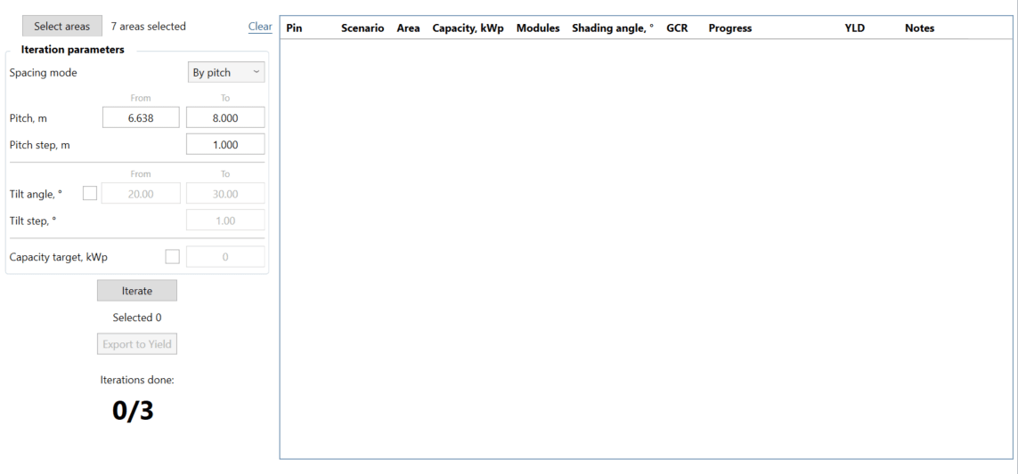 The iteration process can be used to determine the precise pitch, inner spacing, GCR, shading angle and/or tilt angle to reach your capacity. It depends on which iteration options (Spacing mode and tilt angle) you have selected.