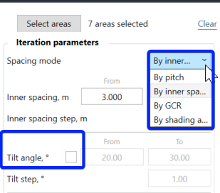 Iterate by spacing and tilt angle - We now choose the desired spacing mode, check the tilt angle option, and specify the steps, start and end values. This way, PVcase will join both iterations into one and we will have results for the same spacing with multiple tilt angles and vice versa.
