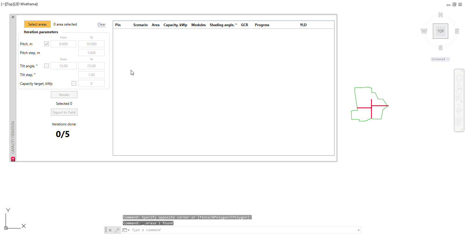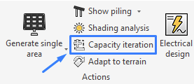 The capacity iteration tool can be used to run calculations to determine if it is possible to fit a certain power capacity within the given area (or multiple areas). It may also be used to populate PV areas with frames as you would using Generate Single Area & Generate Multiple Areas.