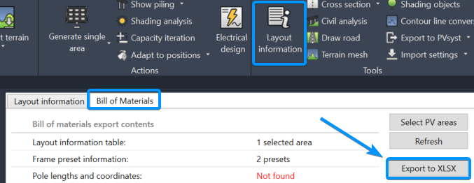 If you have performed capacity iterations, results will automatically be included in the BOM. In Layout information, just use the Export to XLSX as usual: