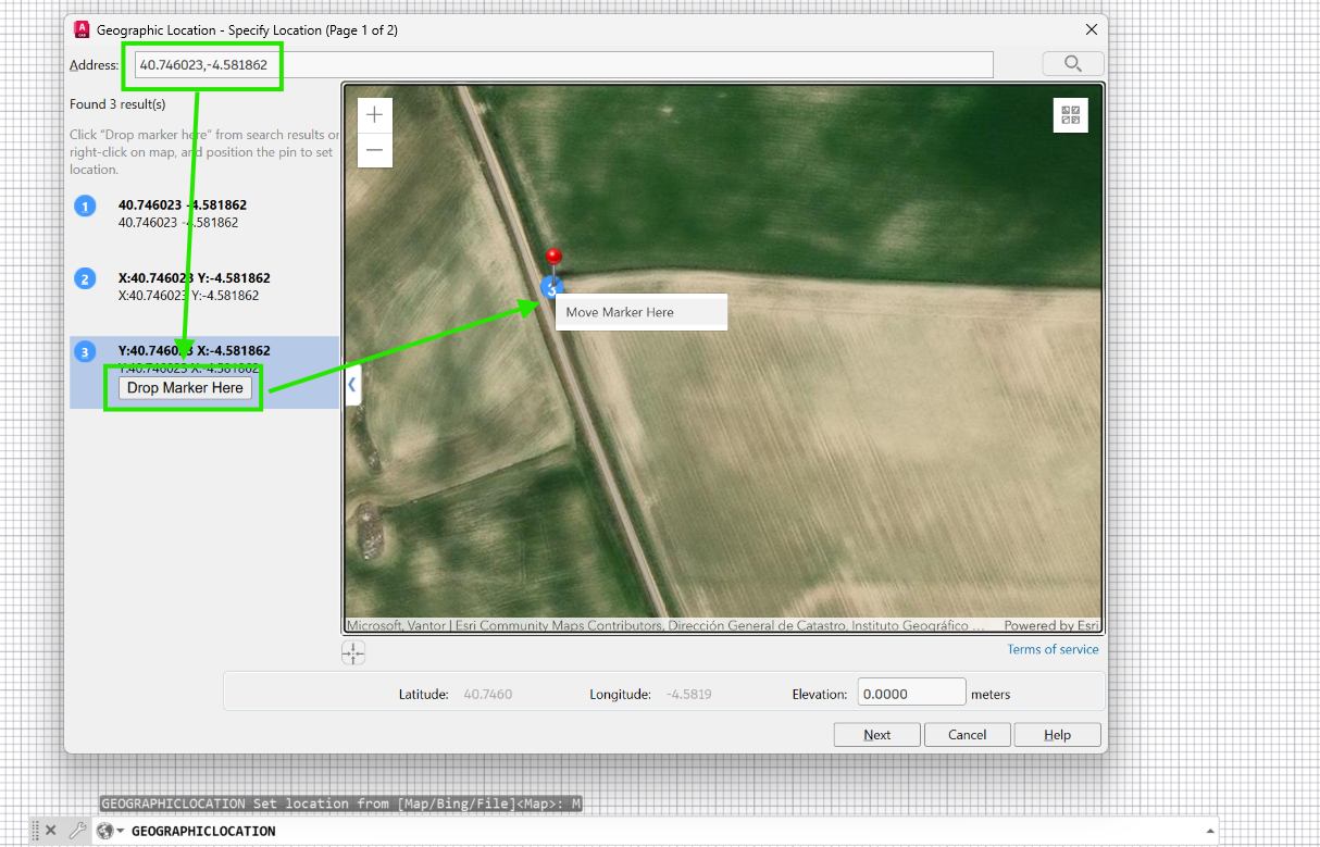 Keep in mind that the location where the marker was placed (the red circle) using the GEO command may not align with the internal origin of coordinates (X, Y axes) within your AutoCAD project.