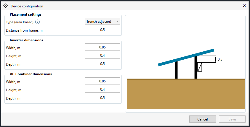 Device Configuration Modal: Set height, width, and depth for inverters and combiners, choose placement type, and adjust distance to frame or ground. Visual previews and tooltips included, so you don’t have to guess what “Option 3” means